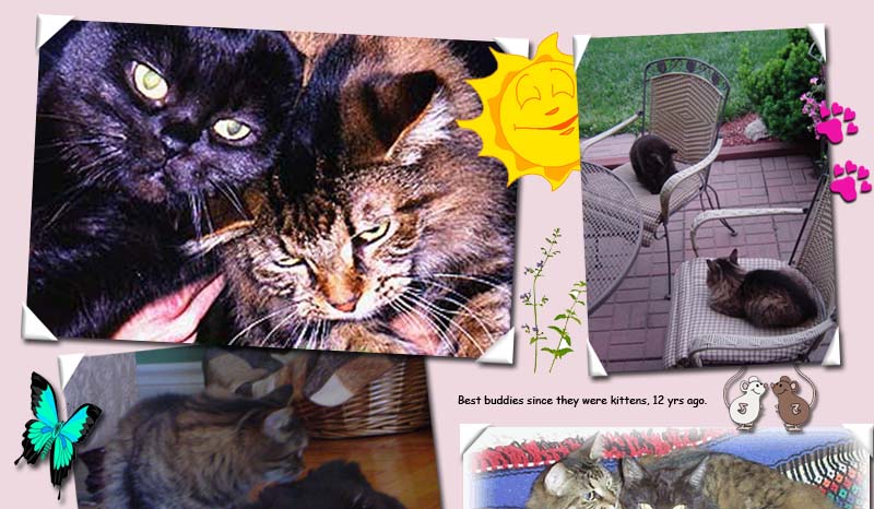 When Ripley came home with us, Dexter was not impressed. He hissed and ran upstairs where he hid for the next couple of days. He was six months old and Ripley was six weeks, and hardly 'scary' looking, but Dexter would have nothing to do with even being around her. After about a week things had started to settle down a little and Dexter no longer hissed when Ripley came near, but he was still very aloof and suspicious. Eventually he realized that she was rather fun to be around and soft to curl up next to. Over time they became best play and cuddle buddies. They loved playing tag late at night and they enjoyed venturing out to the "wilds" of the fenced in backyard. Ripley was always far calmer and braver than Dexter, and she eventually grew larger than him. It was difficult to know who the 'boss cat' was. We knew it changed, but even so, it was hard to discern. Ripley and Dexter were so close that I think that's perhaps why there was never any real need for 'top cat', but that it was more of a game or mood thing for them. |  |